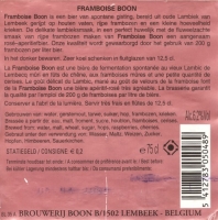 Framboise BoonFramboise Boon is een bier van spontane gisting, bereid uit oude en jonge lambiek van Lembeek, gerijpt op eiken vaten. Onze kwaliteit wordt gewaarborgd door het gebruik van 250 gram frambozen per liter bier. De Framboise Boon Millésime 1986 kreeg in 1995 de prijs van "beste bier van het jaar" van het vakblad "Malt Advocate" uit de USA.