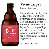vicus tripeldonkerblond licht gesluierd zacht bier met een fijne bitterheid in de afdronk. met fruitig aroma en pittige moutsmaak is hij perfect voor de gezellige avonden in fijn gezelschap .