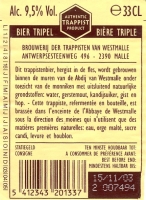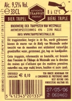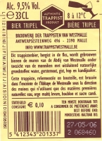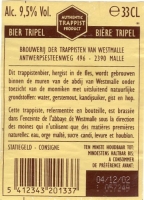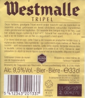 Tripel van Westmalle is een helder, goudgeel trappistenbier dat gedurende drie weken nagist in de fles (9,5 alcohol). Het is een complex bier met een fruitige geur en een mooie, genuanceerde hopneus. Het is zacht en romig in de mond, met een bittere toets gedragen door het fruitaroma. Een uitzonderlijk bier, met veel finesse en elegantie. En met een heerlijk lange afdronk. De Westmalle Tripel wordt wel eens de "moeder van alle tripels" genoemd. Dit type bier werd in 1934 voor het eerst in de abdij van Westmalle gebrouwen naar aanleiding van de ingebruikname van de nieuwe brouwzaal. De huidige formule blijft al sinds 1956 - dus meer dan 50 jaar - nagenoeg onveranderd. Dit bier wordt meestal geschonken uit flesjes van 33 cl, precies de inhoud van het bijbehorende kelkglas. De flesjes worden per stuk, in handige mandjes van zes of in kratten van 24 flesjes te koop aangeboden. En uiteraard schenken ze dit bier ook in de betere horecazaken. De Tripel kunt u ook krijgen in flessen van 75 cl. Opmerkelijk is dat het bier in deze grotere flessen op een andere manier rijpt. De fruitige geur is wat zachter en rijper, en het bier krijgt een lichte vanilletoets mee.